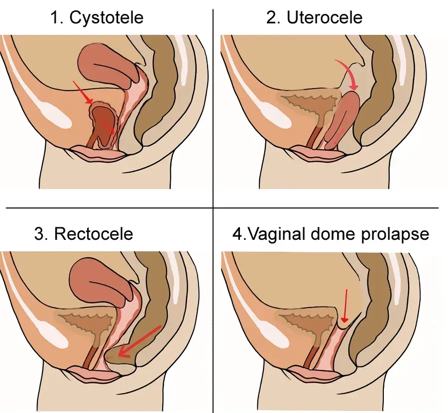 En todos los tipos, los síntomas más comunes son una , plenitud o presión en la pelvis, una sensación de que algo sobresale de la vagina o problemas de incontinencia (pérdida) o retención (dificultad para el paso) de la orina o de las deposiciones.